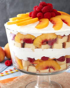 This Peach Raspberry Sangria Trifle is a sunny, delightful dessert recipe that is full of fresh flavor. The traditional trifle recipe flavors that everyone loves are here, with fresh fruit, fluffy pound cake, and freshly whipped cream. The fun twist comes from a dose of sweet white wine, which transforms this trifle into a festive (adults only) alcoholic dessert. The flavors marry in a delightful way, and you and your guests will just love the taste of this recipe. As a bonus, it also looks as wonderful as it tastes!