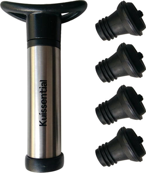 The Kuissential Wine Pump Set includes everything you need to keep four opened bottles of wine fresh and ready to enjoy another day. The stopper fits over any standard bottle of wine and the stainless-steel pump goes over it to extract the air from the bottle. Releasing the stopper is simple because you just need to pull up on it.